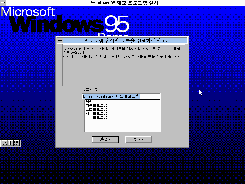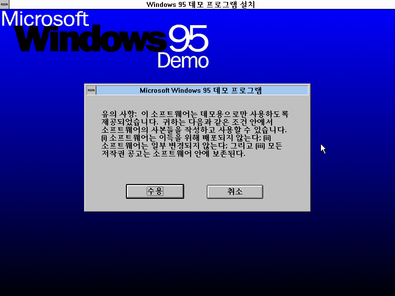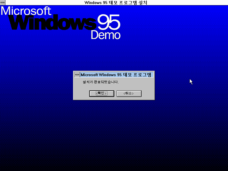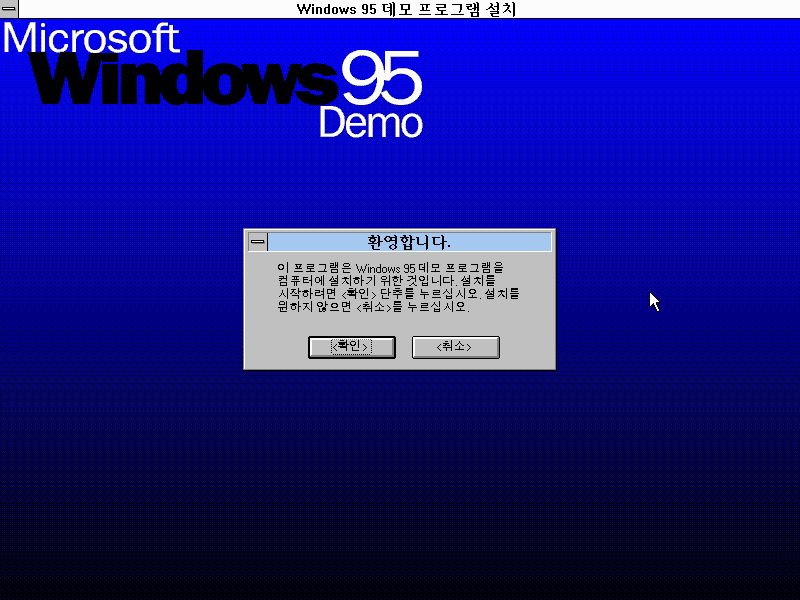 윈도우 95 데모 프로그램 설치를 시작합니다. 확인을 누릅니다.