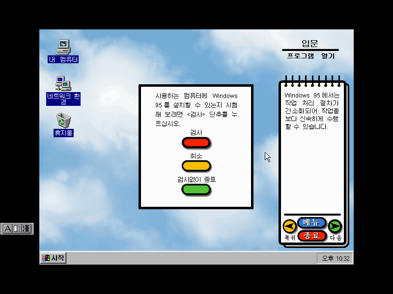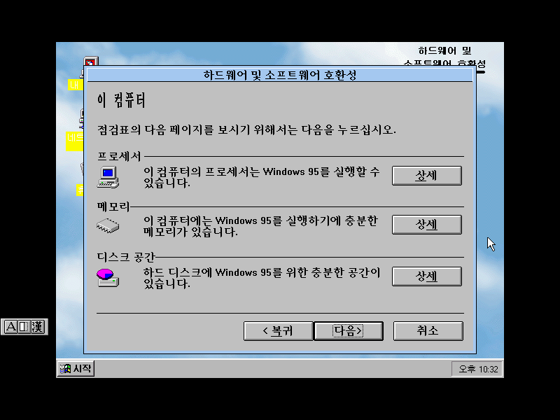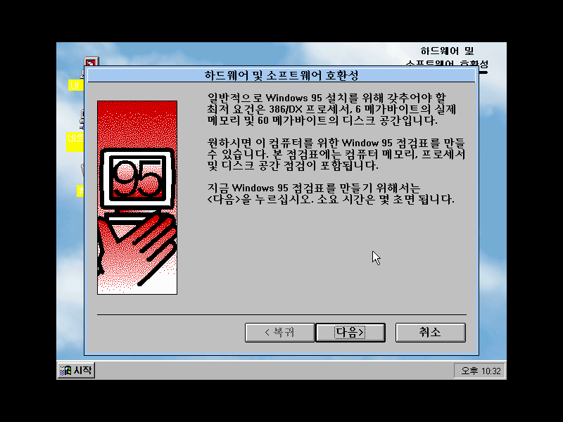 종료하기 전에 사용자의 컴퓨터에 윈도우 95를 설치할 수 있는지 검사할 수 있습니다.