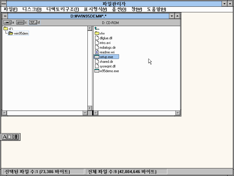 윈도우 3.1에 윈도우 95 데모 프로그램 CD를 넣고 설치를 해보겠습니다.