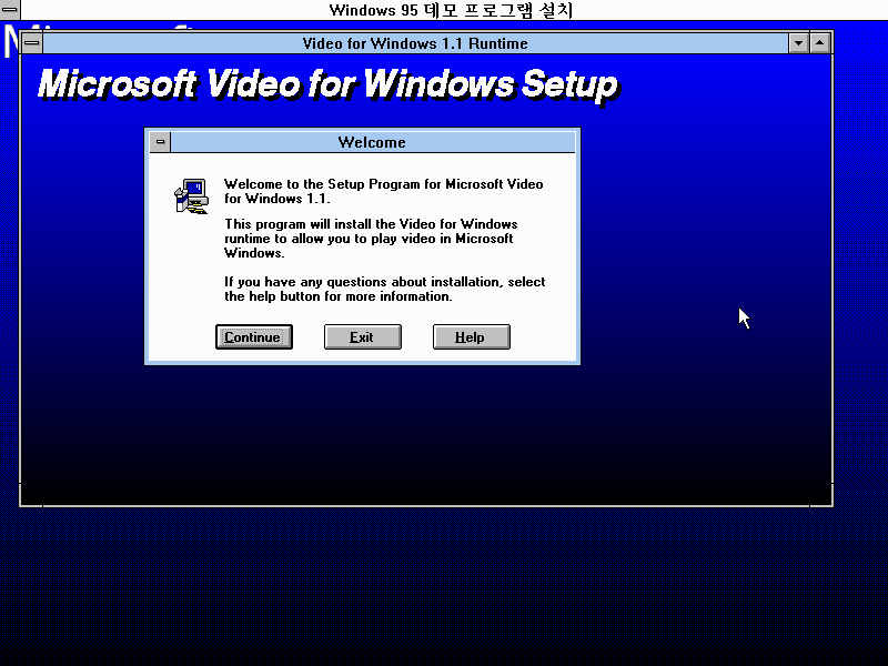 Microsoft Video for Windows 1.1입니다. Continue를 누릅니다.