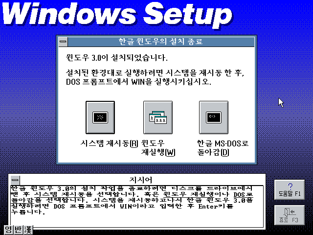 윈도우 3.0이 설치되었습니다. 디스크를 빼고 시스템 재시동을 누릅니다.