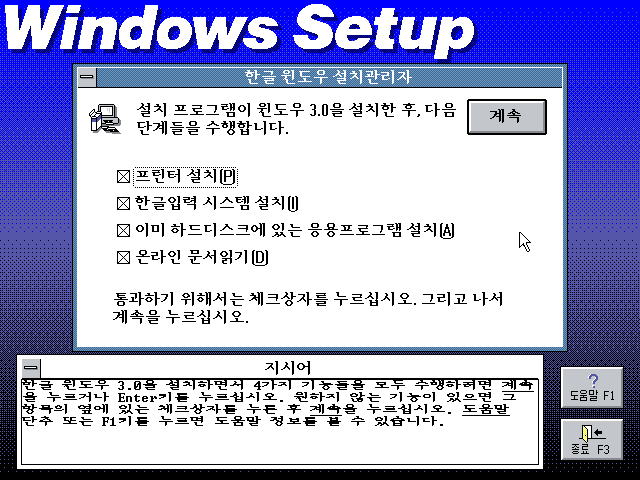 Windows 3.0 한글판을 설치해보았습니다. 윈도우 3.0은 그 전의 윈도우로부터 많은 것이 변했습니다. 이전까지 도스 셀 프로그램 형태였던 윈도우가 GUI를 처음으로 갖춘 윈도우 버전입니다. 한글판으로는 두번째로, 그 전에 한글 윈도우 2.1이 있었습니다만, 현재로서는 찾기가 어렵네요.