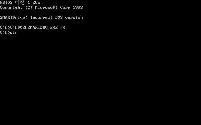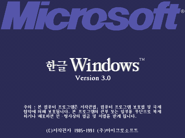 한글 윈도우 3.0의 부팅화면입니다. 뭔가 간단하면서 클래식해보입니다. 우리가 아는 윈도우 로고는 아직 나오지 않았습니다.