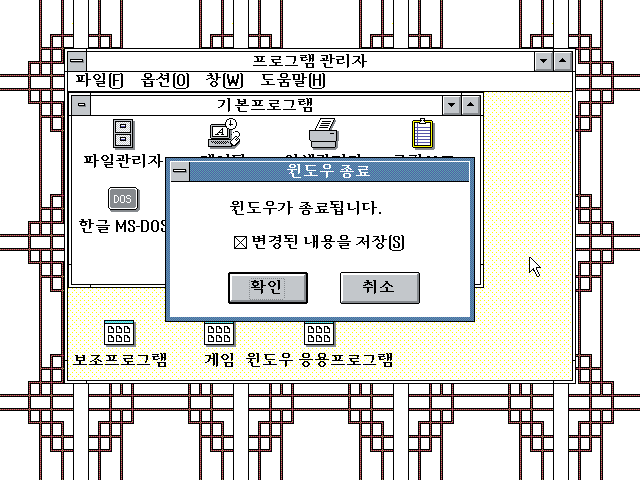 한글 윈도우 3.0의 모습입니다. 시작 버튼이나 작업표시줄은 아직 없을 때입니다. 그래도 창 형태는 있네요. 바탕화면이 무슨 한옥의 창호지 무늬입니다. 나름 한국이라고 현지화를 한 것 같은데, 다채롭네요.