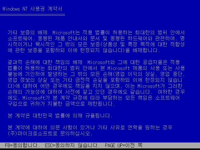 사용권 계약서입니다. 윈도우 2000부터는 그냥 넘길 수 있지만, NT 4.0까지는 다 읽어줘야 합니다. PgDn 키를 쭉 눌러줍니다.