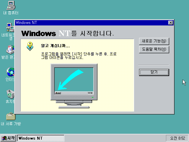 윈도우 NT 4.0이 설치되었습니다. NT라는 사실을 모르고 보면 윈도우 95와 똑같습니다. 심지어 처음 나오는 도움말마저 똑같습니다.