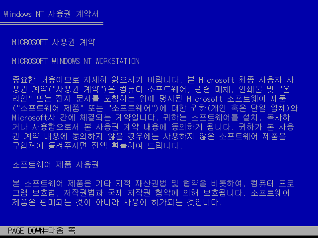 사용권 계약서입니다. 윈도우 2000부터는 그냥 넘길 수 있지만, NT 4.0까지는 다 읽어줘야 합니다. PgDn 키를 쭉 눌러줍니다.