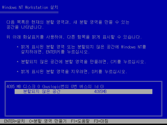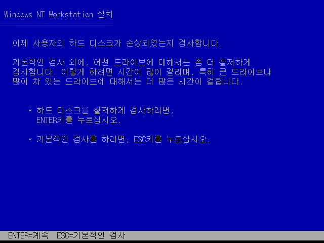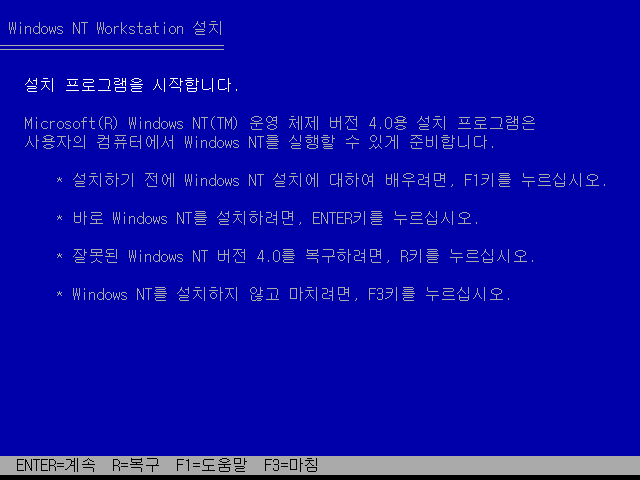 윈도우 NT 워크스테이션 설치를 시작합니다. 엔터를 누릅니다.
