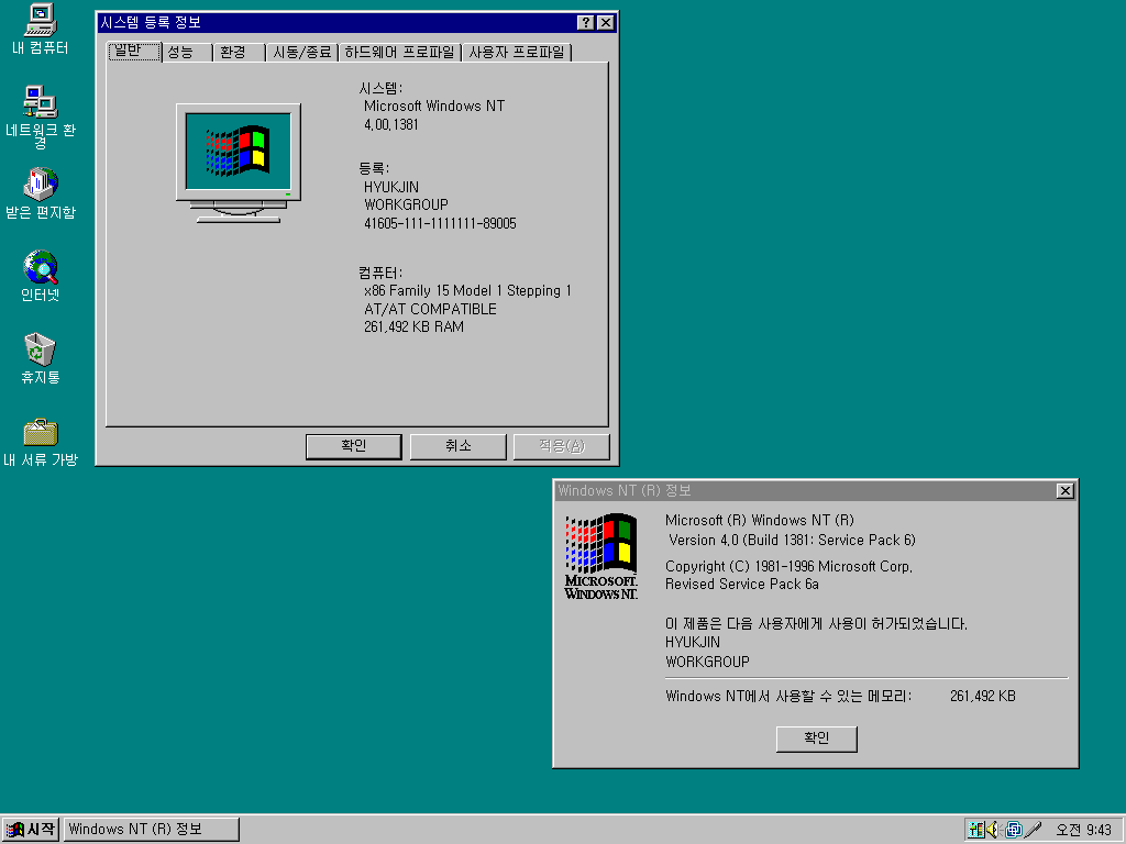 시스템 등록 정보입니다. 윈도우 NT 4.0입니다. 빌드넘버는 4.00.1381이고, 서비스 팩 6이 설치된 상태입니다.