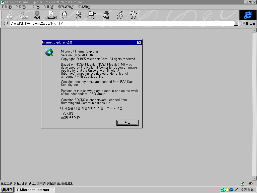인터넷 익스플로러입니다. 버전 3.0입니다. 빌드 넘버는 4.70.1158입니다. 영문판 NT 4.0은 기본 버전이 2.0이고, 한글판은 기본 버전이 3.0입니다. 윈도우 NT 4.0은 IE 6.0까지 지원합니다.
