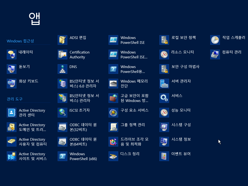 앱 목록입니다. 확실히 서버 운영체제라서 그런지 메트로 UI에서 사용 가능한 앱은 별로 없습니다.